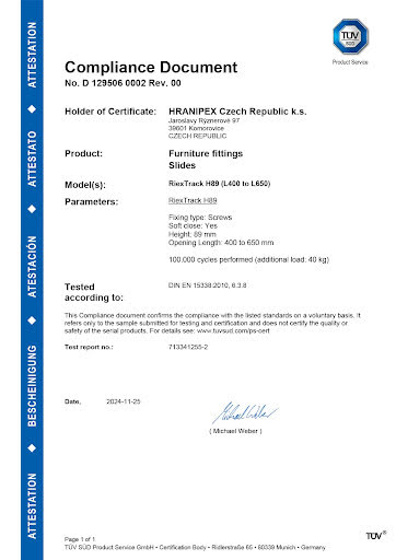 Sistemul de sertare cu laterale metalice RiexTrack oferă o soluție eficientă pentru asamblarea sertarelor. Cu panouri laterale metalice înguste de 13 mm și glisiere integrate cu închidere amortizată, acesta asigură o funcționare lină, o stabilitate laterală excelentă și o performanță de lungă durată. Certificată TÜV pentru a suporta până la 40 kg, aceasta combină durabilitatea cu funcționalitatea.